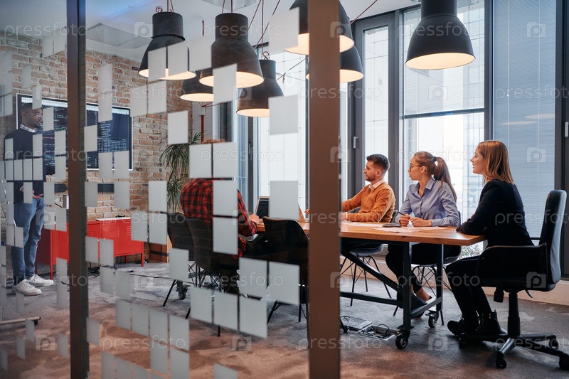 В элегантном стеклянном офисном помещении команда профессионалов бизнеса ведет оживленные дискуссии и обменивается стратегическими идеями, демонстрируя сотрудничество и инновации, лежащие в основе современной корпоративной культуры