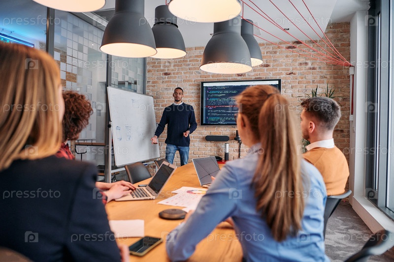 Афроамериканский бизнесмен проводит совещание, страстно представляя бизнес-план своей внимательной команде, способствуя сотрудничеству и стратегическому мышлению