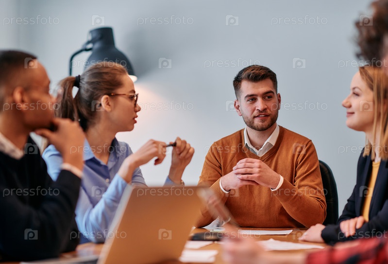 В яркой атмосфере современного офиса стартапа разнообразная команда профессионалов в сфере бизнеса участвует в обсуждениях различных проектов и разрабатывает новые бизнес-стратегии, олицетворяя креативность и инновации в предпринимательской среде