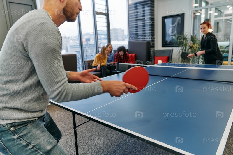 Коллеги по бизнесу отдыхают от работы, чтобы поиграть в настольный теннис, способствуя командной работе и товариществу на рабочем месте
