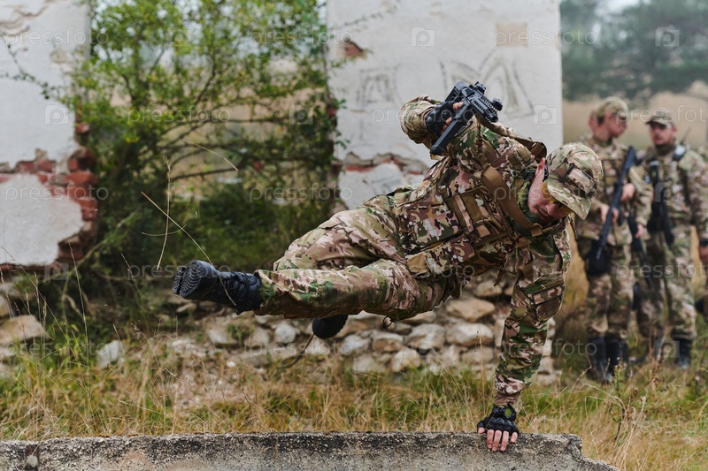 Высококвалифицированное элитное военное подразделение, одетое в камуфляж, умело перемещается по опасной лесной местности, преодолевая препятствия и выполняя точную и скрытную миссию