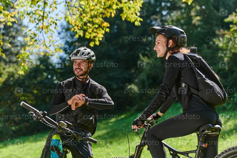 Милая парочка, вооруженная велосипедами и поглощенная планированием своего путешествия, проверяет свои мобильные телефоны и часы, планируя живописные маршруты в парке, органично сочетая технологии и приключения на свежем воздухе для восхитительного опыта