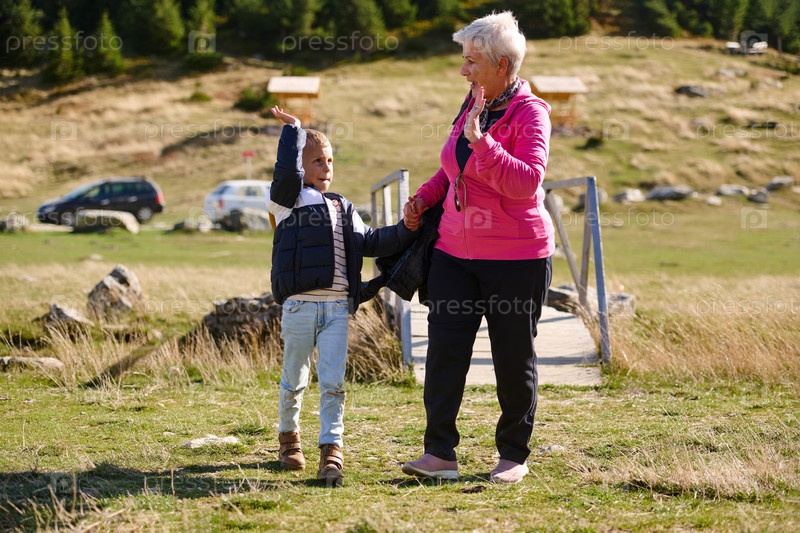 Пожилая бабушка и ее внук неспешно прогуливаются на природе, любуясь красотой окрестностей, укрепляя связь, которая перерастает поколения