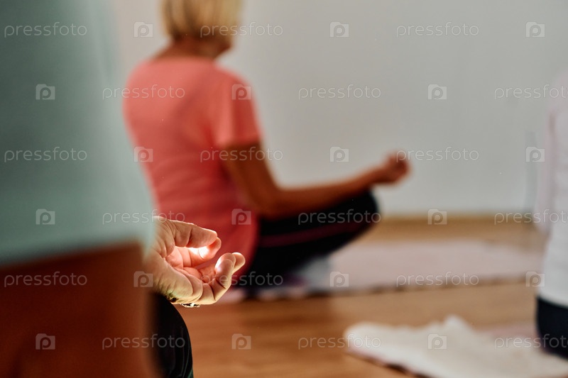 В этом залитом солнцем пространстве рука пожилой женщины грациозно выполняет различные позы йоги, олицетворяя суть активного старения, здоровья и внутреннего покоя
