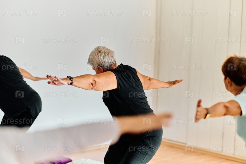 Группа пожилых женщин занимается различными упражнениями йоги, включая растяжку шеи, спины и ног, под руководством тренера в залитом солнцем месте, способствуя благополучию и гармонии