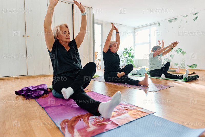 Группа пожилых женщин занимается различными упражнениями йоги, включая растяжку шеи, спины и ног, под руководством тренера в залитом солнцем месте, способствуя благополучию и гармонии