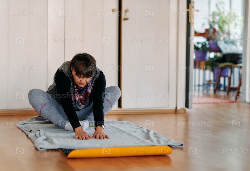 Пожилая женщина выполняет упражнение на растяжку спины в современной, залитой солнцем студии
