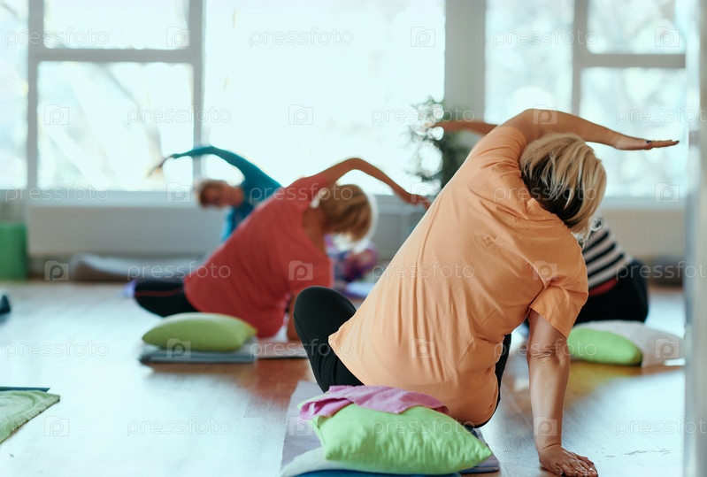 Женщины старшего возраста занимаются оздоровлением: йогой и растяжкой в залитом солнцем пространстве