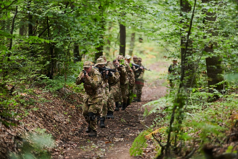 Дисциплинированное и специализированное военное подразделение, облаченное в камуфляж, осуществляющее стратегическое патрулирование и сохраняющее контроль в обстановке с высокими ставками, демонстрирующее свою точность, сплоченность и готовность к специаль