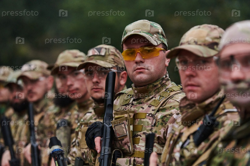 Солдаты-бойцы стоят вместе с оружием. Групповой портрет элитных членов армии США, военнослужащих частной военной компании, антитеррористического отряда