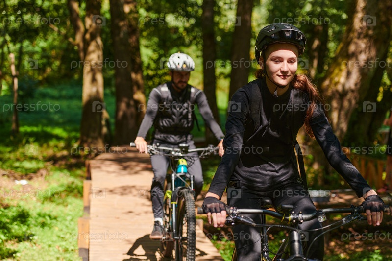 Счастливая пара, одетая в профессиональную велосипедную экипировку, наслаждается романтической велопрогулкой по парку, окруженному современными природными достопримечательностями, излучая любовь и счастье