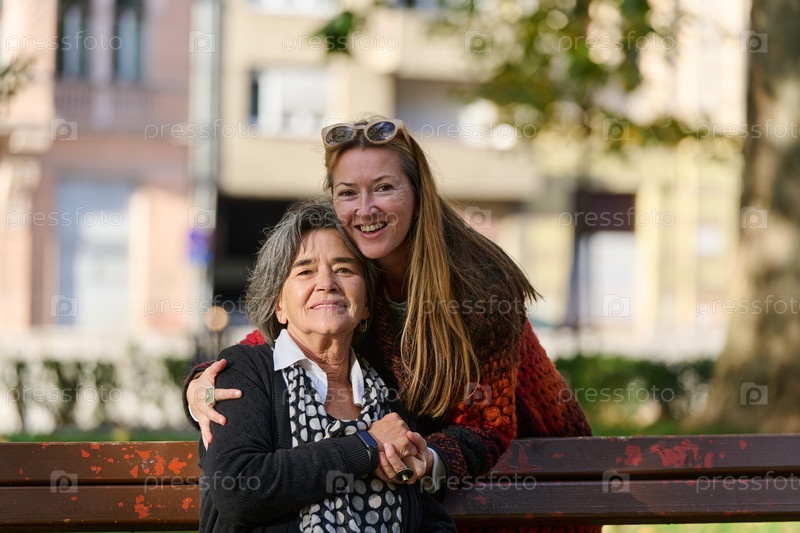 Обнимая поколения: любовь и поддержка дочери для ее пожилой матери в солнечный день в парке