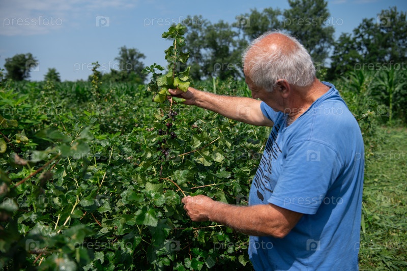Старший фермер тщательно осматривает свою черничную ферму, чтобы убедиться в качестве и прогрессе