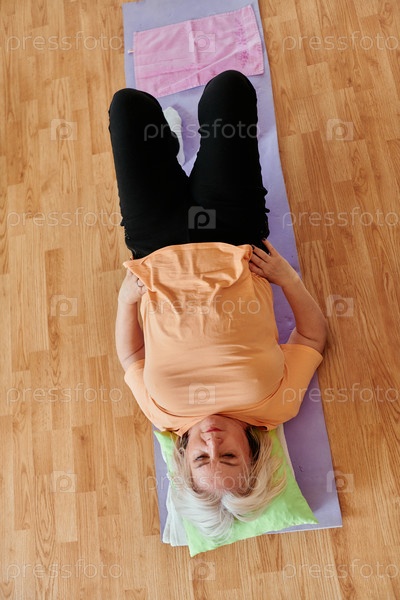 Пожилая женщина практикует растяжку и медитацию на полу, уделяя особое внимание правильному выравниванию и расслаблению