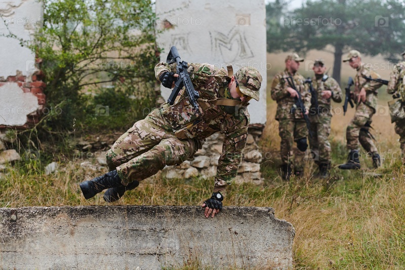Высококвалифицированное элитное военное подразделение, одетое в камуфляж, умело перемещается по опасной лесной местности, преодолевая препятствия и выполняя точную и скрытную миссию