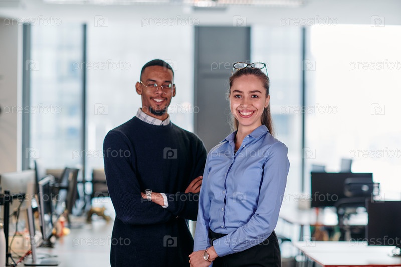 Динамичное деловое сотрудничество: светловолосая бизнес-леди и ее афроамериканский коллега в современной офисной обстановке