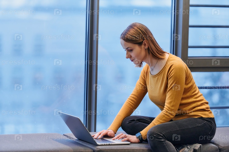 Деловая женщина пользуется ноутбуком, сидя у окна большого корпоративного здания, на фоне которого открывается живописный вид на городской пейзаж