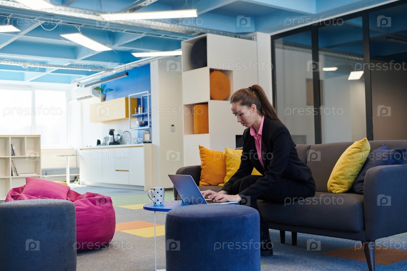 Занятая бизнес-леди, использующая смартфон. Счастливая молодая бизнес-леди в одиночестве в современном коворкинге открытого пространства офиса на рабочем месте. Бизнес-леди, общающаяся со своими клиентами в офисе