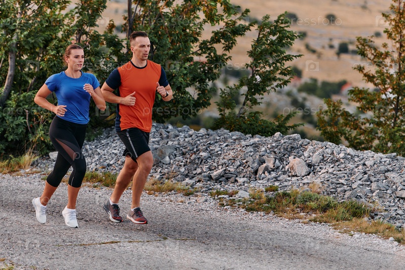 Пара в спортивной одежде бежит по живописной дороге во время утренней тренировки, наслаждаясь свежим воздухом и поддерживая здоровый образ жизни