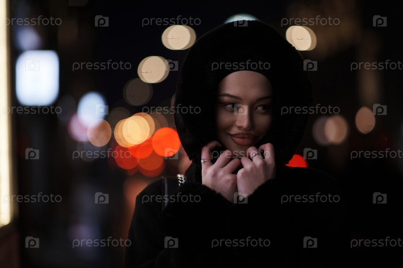 Мусульманка идет по городской улице холодной зимней ночью в хиджабе