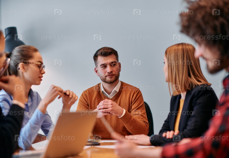 В яркой атмосфере современного офиса стартапа разнообразная команда профессионалов в сфере бизнеса участвует в обсуждениях различных проектов и разрабатывает новые бизнес-стратегии, олицетворяя креативность и инновации в предпринимательской среде