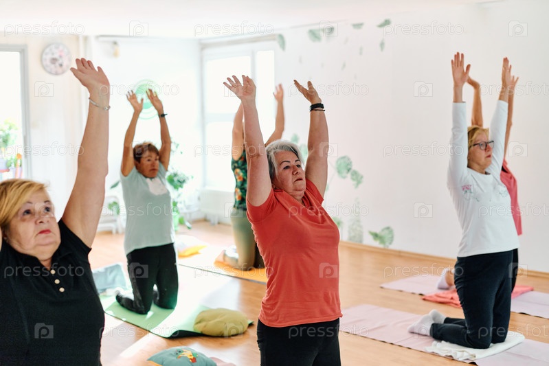 Группа пожилых женщин занимается различными упражнениями йоги, включая растяжку шеи, спины и ног, под руководством тренера в залитом солнцем месте, способствуя благополучию и гармонии