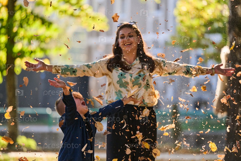 Современная женщина с радостью играет со своим сыном в парке, подбрасывая листья в прекрасный осенний день, запечатлевая суть семейной жизни и теплоту отношений матери и сына в разгар осени