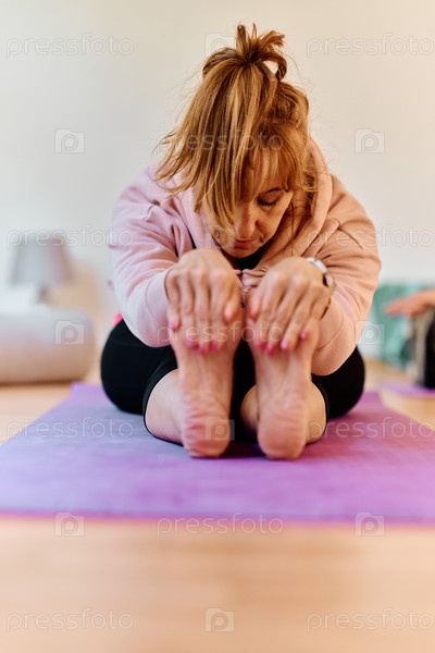 В залитом солнцем помещении пожилая женщина грациозно занимается омолаживающей йогой, уделяя особое внимание растяжке шеи, спины и ног, воплощая спокойствие и благополучие