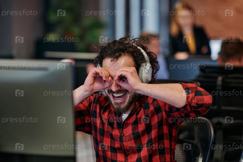 Радостное сотрудничество: мужчина с энтузиазмом принимает удаленную работу в коворкинг-пространстве