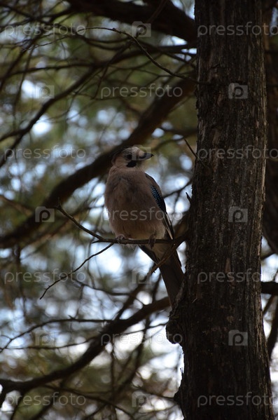 Соя обыкновенная (Garrulus glandarius) - птица рода соек семейства воронов отряда воробьиновидных среди ветвей деревьев