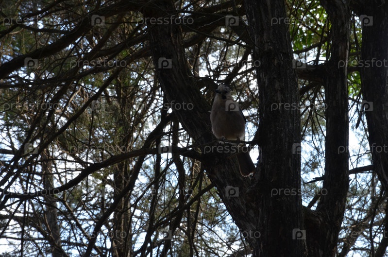 Соя обыкновенная (Garrulus glandarius) - птица рода соек семейства воронов отряда воробьиновидных среди ветвей деревьев