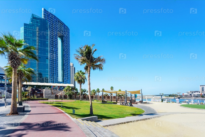 Пляж Дубай Джумейра с отелями, морем, песком, пальмами и голубым небом