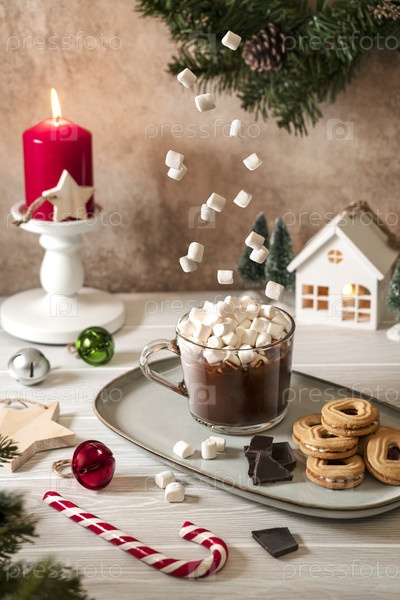 Рождественский домашний горячий шоколадный напиток с белыми мини-зефирками, парящими в воздухе. Рождественский фон с горячим шоколадом с зефиром в стеклянной кружке. Изображение левитации