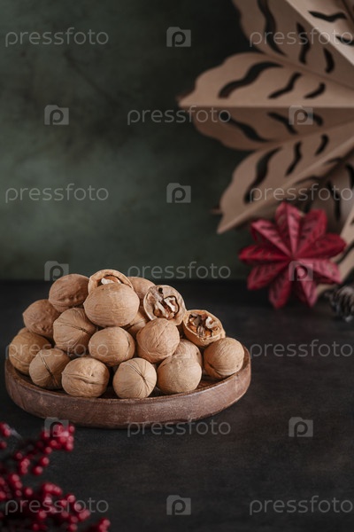 Рождественский фон с грецкими орехами в скорлупе на деревянном подносе. Композиция с горкой грецких орехов на деревянном подносе на столе
