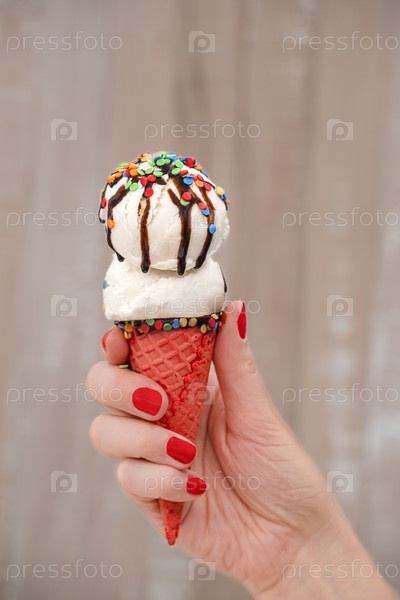 Крупный план женской руки, держащей ванильное мороженое. Ванильное мороженое с сахарной посыпкой и шоколадом в женской руке на светлом фоне