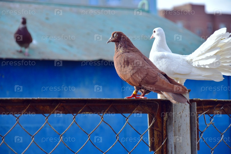 Красивый голубь белый и коричневый из голубятни во дворе птица