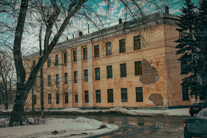 Мрачный красивый советский старинный дом слякоть на улице в городе зимой снег