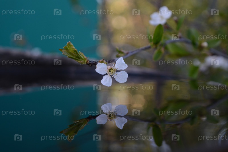 Ветка с белыми цветами вишни отражается в воде