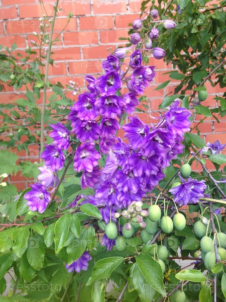 Фиолетовые дельфиниумы и ветка с зелеными сливами