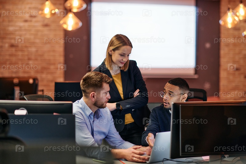 Стратегическая бизнес-встреча: группа профессионалов, работающих в офисе с использованием компьютеров