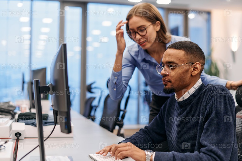 Цифровое сотрудничество: светловолосая бизнес-леди и ее партнер-афроамериканец просматривают документы онлайн