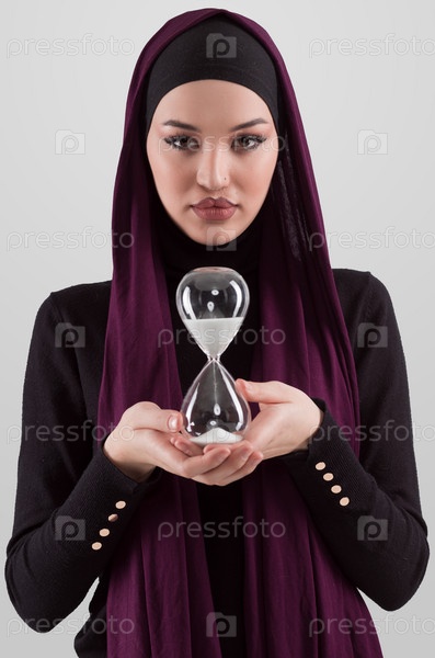 Красивая арабская бизнесвумен в хиджабе и держит песочные часы. Время идет, и это концепция давления