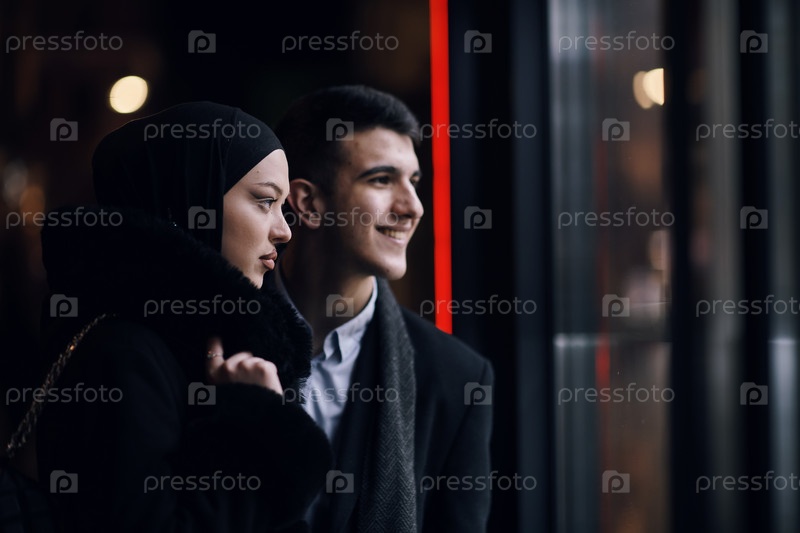 Счастливая мультикультурная деловая пара прогуливается вместе на улице города ночью возле витрины ювелирного магазина