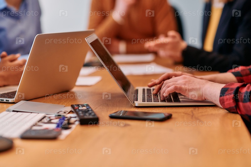 Бизнесмен на работе. Крупный план сверху на человека, работающего на ноутбуке, сидящего за деревянным столом