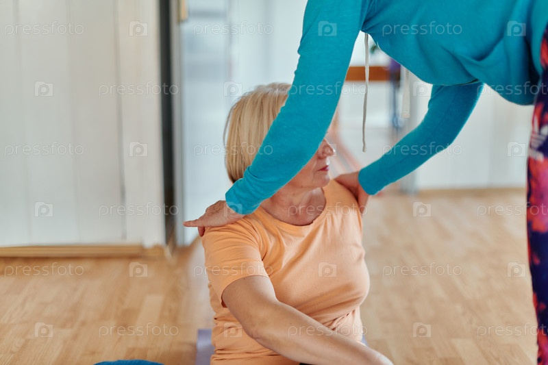 Женщины старшего возраста занимаются оздоровлением: йогой и растяжкой в залитом солнцем пространстве