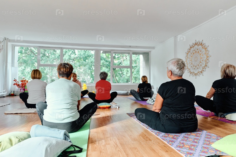 Группа пожилых женщин занимается различными упражнениями йоги, включая растяжку шеи, спины и ног, под руководством тренера в залитом солнцем месте, способствуя благополучию и гармонии