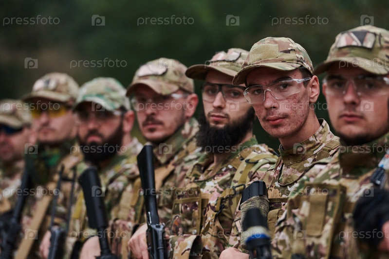 Солдаты-бойцы стоят вместе с оружием. Групповой портрет элитных членов армии США, военнослужащих частной военной компании, антитеррористического отряда