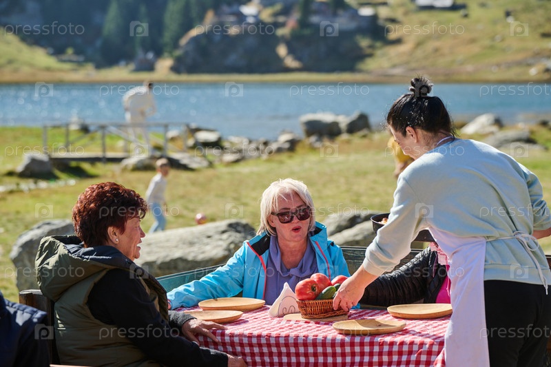 Группа старших друзей оживленно беседует с официанткой, обсуждая свои предпочтения в еде и наслаждаясь приятной атмосферой товарищества, которая сопровождает их обед