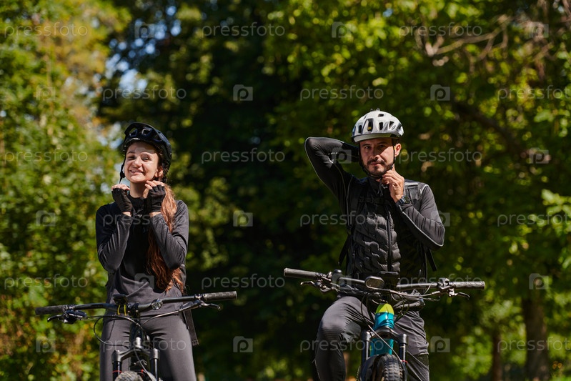 Счастливая пара, одетая в профессиональную велосипедную экипировку, наслаждается романтической велопрогулкой по парку, окруженному современными природными достопримечательностями, излучая любовь и счастье