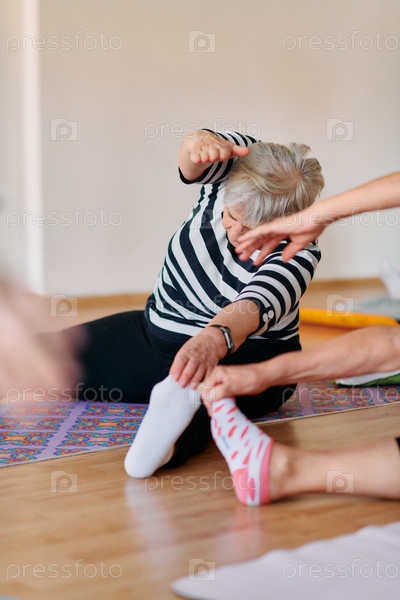 Женщины старшего возраста занимаются оздоровлением: йогой и растяжкой в залитом солнцем пространстве